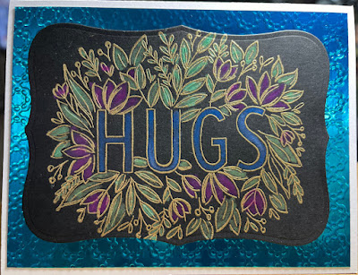 The "Hugs" sentiment was die cut and layered on top of the black letters. The whole die cut is popped off the foil panel with foam strips under the letters.