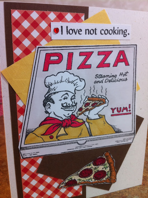 The red patterned paper was left over from a kit from last summer, it was a backyard barbecue theme, but I thought that it also looked like a tablecloth one might find in a pizza parlor. The image is colored with Spectrum Noir markers and the little heart gem is from my stash (probably from Michael's).